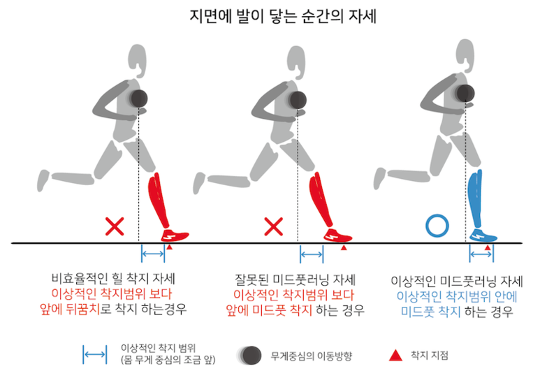 - 힐 스트라이크 : 발이 지면에 닿는 방식이에요. 이때 발이 몸 앞쪽에 너무 멀리 떨어져서 착지하면 힘이 분산되어 부상이 생길 수 있어요.