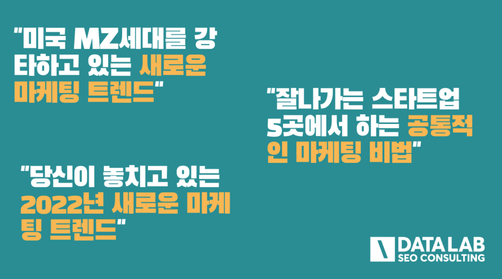 또한, "2022년 새로운 마케팅 트렌드"와 같은 제목은 최신 정보를 제공하는 느낌을 주어 클릭률을 높일 수 있어요.